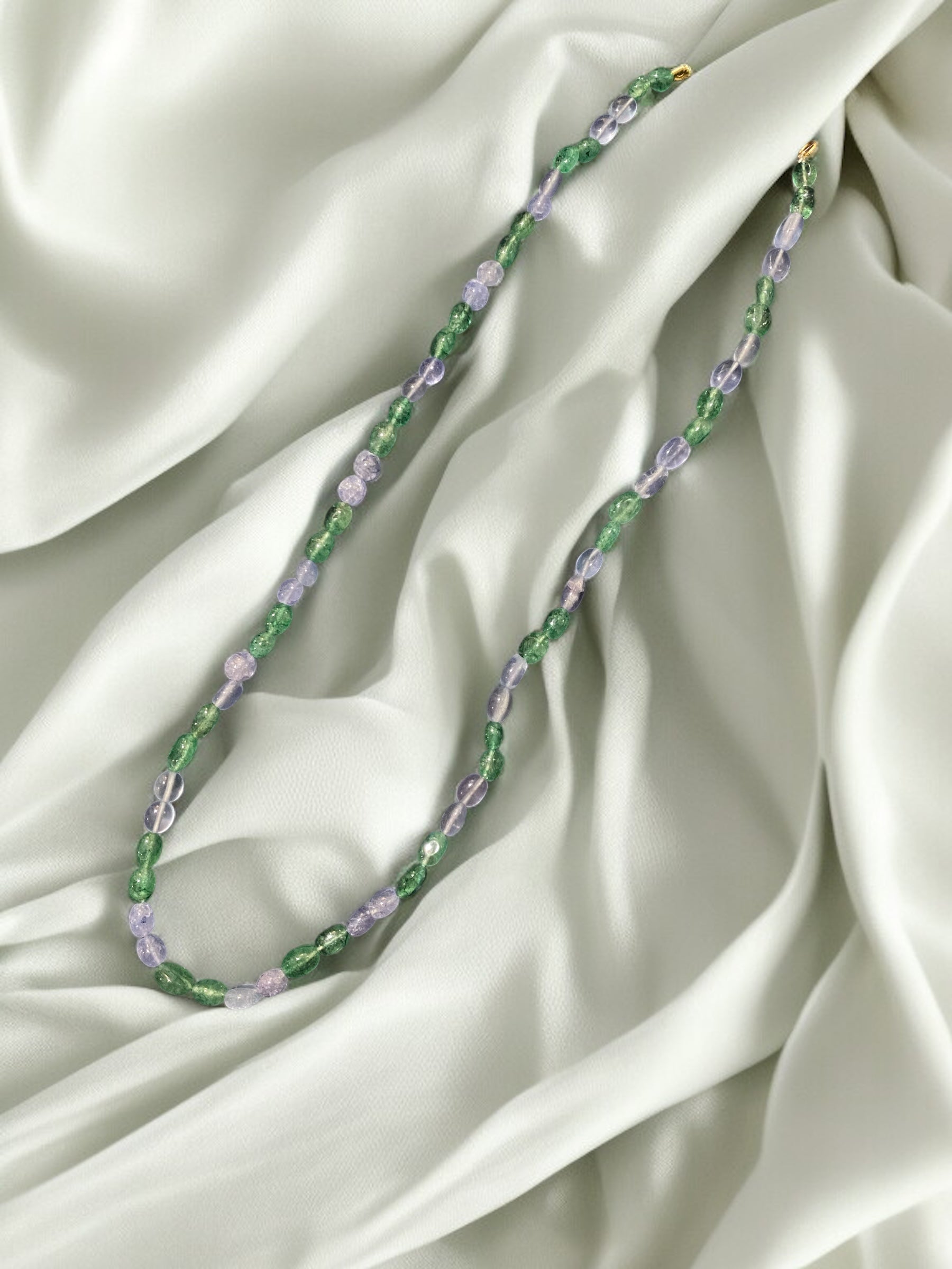 A stunning necklace featuring alternating green and purplish-blue semi-precious beads on a jewelry bust.