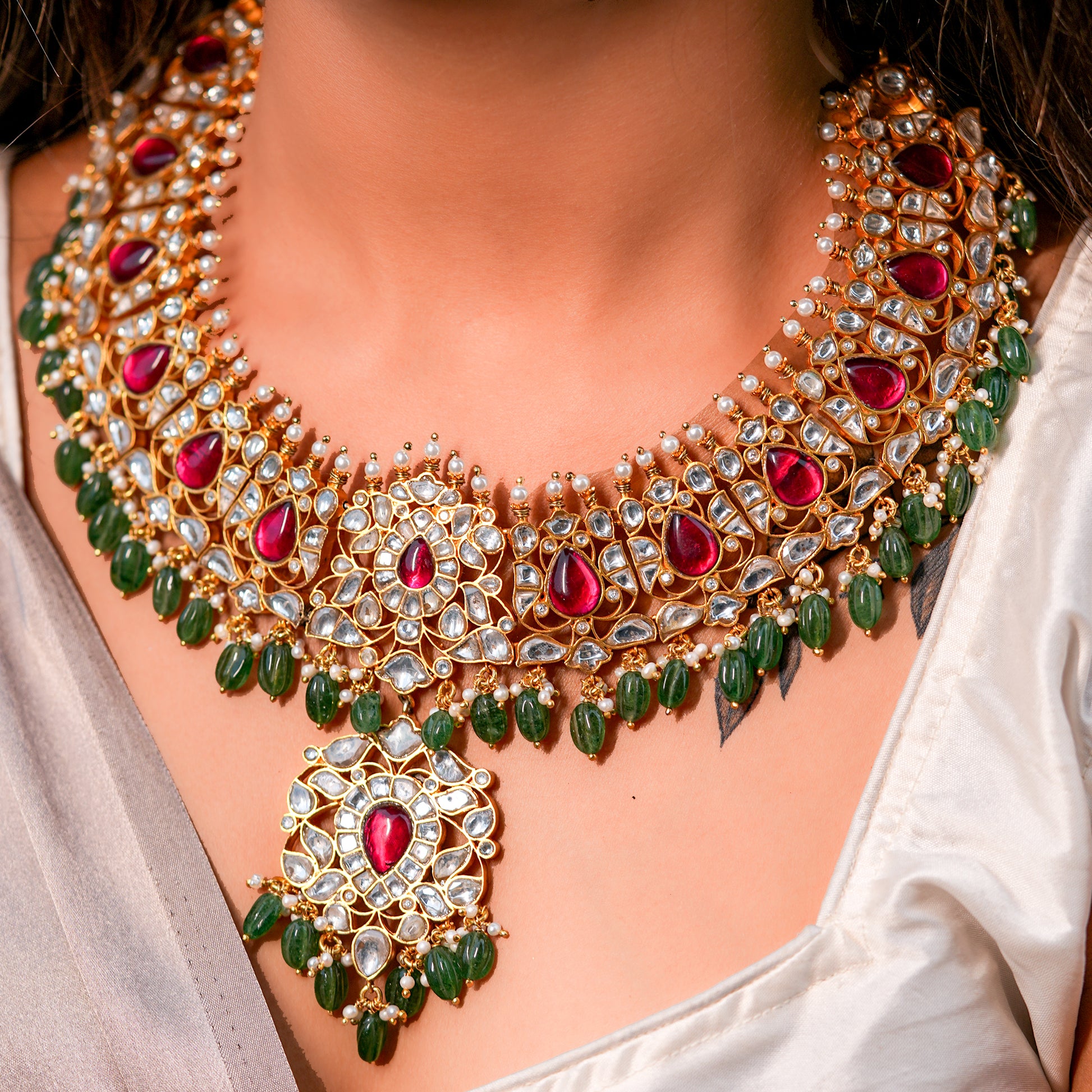 Kundan necklace with ruby stones, green beads, and gold plating with matching earrings — traditional and festive.
